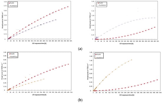 The photodegradation process of PLA and their considered blend was analyzed by monitoring the progress in the exposure time of 1845 cm−1 and 1725 cm−1 peaks, linked to the degradation pathway of PLA and PA11, respectively. According to the literature, the PA11 photo-oxidation process can be profitably monitored following the changes in heights of the peak at 1725 cm−1 as a function of UV irradiation time. As is known, this peak is assigned to the formation of new oxygen-containing species (e.g., carbonyl and carboxyl functionalities) [].
