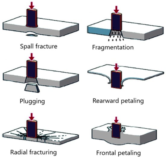 13]. The penetration modes have a further delineation depending on the material and its properties. During an impact event, a compression–tension alternating wave is also generated (especially in low-density materials). If this wave exceeds the tensile strength of the material, radially spaced cracks will occur, which is common in materials with a compression strength greater than the tensile strength [