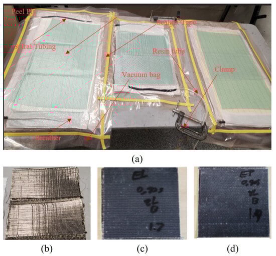 (a) Vacuum resin infusion setup. (b) Biaxial basalt fabric laid before resin infusion. (c) Typical Elium–basalt specimen. (d) Typical Elium–epoxy specimen.