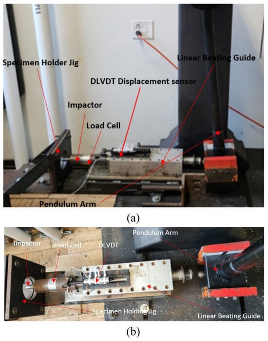 Low-velocity impact test setup: (a) front view; (b) top view.