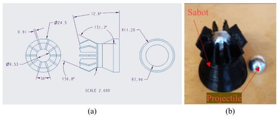 (a) Specifics of the designed sabot. (b) A 3D-printed sabot hosting a projectile.