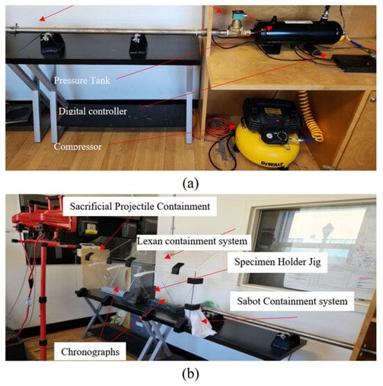High-velocity impact test setup: (a,b) right and left sections of the setup, respectively.