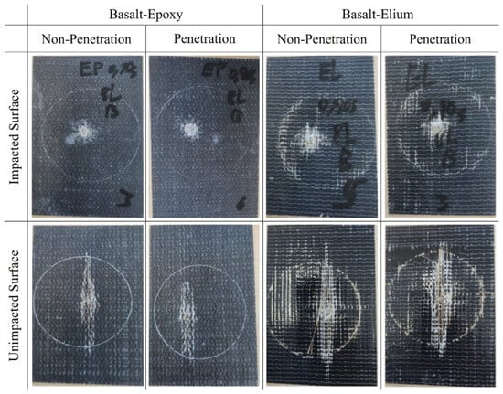 Typical post-high-velocity impact damage patterns on the surfaces of typical basalt–epoxy and basalt–Elium specimens.