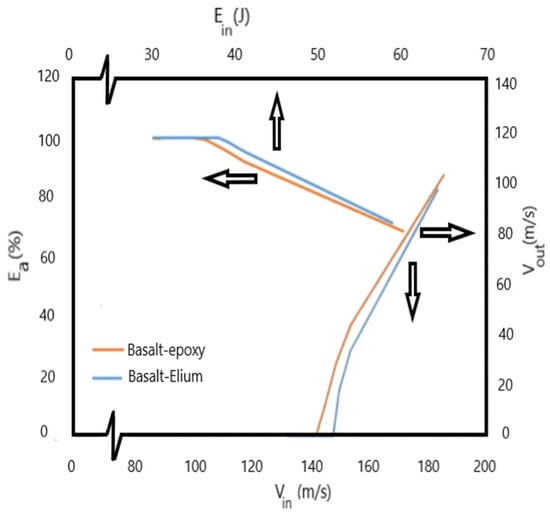 Graphs of impact velocity vs. velocity after penetration and energy incident vs. percent absorbed energy of the two composites.