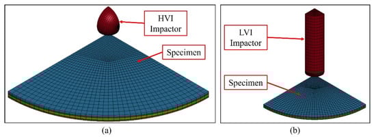 Quarter-symmetry finite element models: (a) HVI model; (b) LVI model.