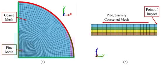 Details of specimen meshing: (a) top view; (b) cross-section view.
