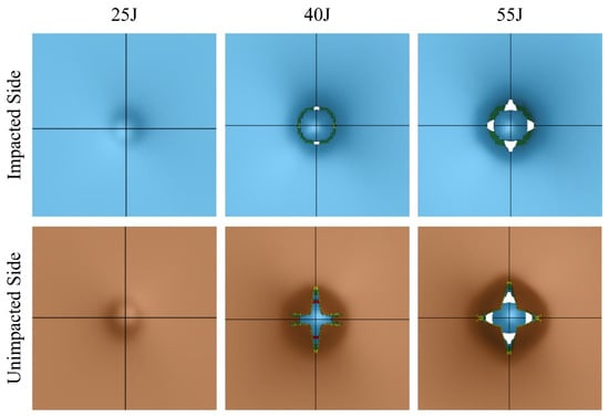 4], is believed to reveal the most critical combination in causing delamination. The matrix cracking mode occurs when the absorbed energy leads to the formation of micro- and macrocracks. Unlike delamination, matrix cracking occurs across fibers. This effect usually occurs when the impact energy is within a smaller range of values, usually below