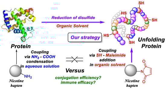 Future studies on nicotine vaccine development remain challenging. However, generally, the development of new kinds of vaccines still focuses on two aspects: the structure of antigens and the use of adjuvants. We have been interested in the development of hapten–protein conjugation methodology for years. Recently, we developed the fast conjugation of a polysaccharide antigen and carrier protein in an organic solvent (dimethylformamide), and the product demonstrated great immunogenicity [19]. We wondered whether such a strategy can be used for a small-molecule, carrier protein conjugate. Furthermore, can thiol groups on a protein be used as conjugation sites (Figure 1)?