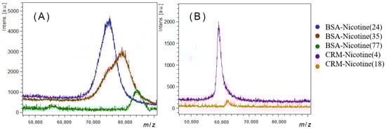 MALDI-TOF-MS spectra of nicotine–BSA (A) and nicotine–CRM197 (B) conjugates.