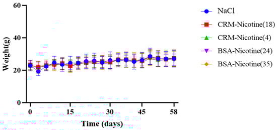 The mice were randomly divided into groups of ten and immunized with the above six vaccines via subcutaneous injection according to the schedule shown in Figure 3. The negative control group was treated with physiological saline instead of vaccines but bled together with the test groups. The mice treated with physiological saline, CRM197-Nicotine(18), CRM197-Nicotine(4), BSA-Nicotine(24), and BSA-Nicotine(35), were weighed before immunization and once every three days during the vaccination protocol to monitor their growth for the associated weight loss possibly related to vaccine-resulted toxicity. The weight-changing curves are demonstrated in Figure 4, which were largely unchanged over the course of experiments.