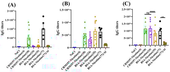 The titers of anti-nicotine IgG antibodies induced by anti-nicotine vaccines. Different bar colors were used to differenciate vaccines: Blue/Control group, Red/CRM197-Nicotine(4), Green/CRM197-Nicotine(18), Pink/BSA-Bicotine(24), Orange/BSA-Nicotine(35), Black/BSA-Nicotine(77), Brown/BSA-Nicotine(77)/Al. (A) IgG titers after the first injection (day 14); (B) IgG titers after the second injection (day 28); (C) IgG titers after the third injection (day 42). Unpaired t-test: ****, p < 0.0001; **, p < 0.001; ns, no significance.