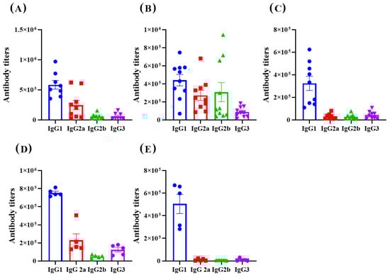 The titers of subclass IgG antibodies after the third injection (day 42). Different bar colors were used to differenciate IgG subclasses: Blue/IgG1, Red/IgG2a, Green/IgG2b, Pink/IgG3. (A) CRM197-Nicotine(18); (B) BSA-Nicotine(24); (C) BSA-Nicotine(35); (D) BSA-Nicotine(77); (E) BSA-Nicotine(77)/Al.