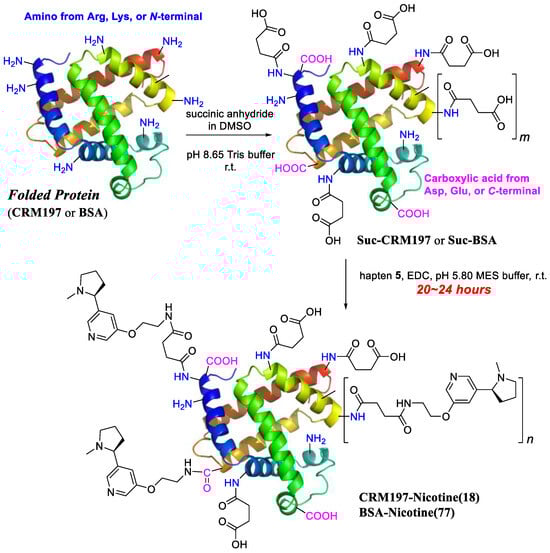 CRM197-Nicotine(18) and BSA-Nicotine(77) were assembled by amino-carboxylic acid condensation in an aqueous phase (Scheme 2). First, CRM197 or BSA was treated with succinic anhydride in an alkaline Tris buffer to acylate the amino groups on the Lys, Arg, or N-terminal of the proteins, resulting in more carboxylic acids on the protein ready for condensation. Then, hapten 5 was conjugated to Suc-CRM197 or Suc-BSA using EDC in an MES buffer to obtain CRM197-Nicotine(18) and BSA-Nicotine(77).