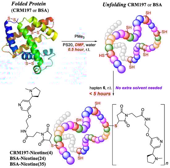 Preparation of CRM197-Nicotine(4), BSA-Nicotine(24), and BSA-Nicotine(35) via protein unfolding and subsequent thiol–maleimide click reaction in an organic solvent.