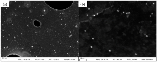 SEM images showed the morphology and size distribution of the G-AgNPs. Figure 2 shows randomly selected areas at different magnifications. These revealed that the G-AgNPs were uniformly distributed and spherical in shape with a diameter range of 5 to ~20 nm, with a mean value of 19 nm. The high-resolution SEM images showed that the surface of the G-AgNPs was smooth and free from any impurities.