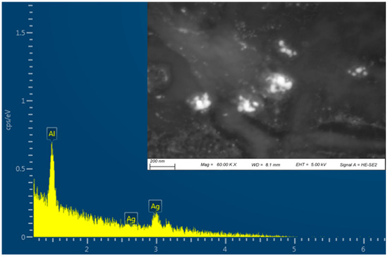 EDS analysis was performed to confirm the elemental composition of the G-AgNPs, and is shown in Figure 3. The EDS spectrum showed a strong peak for silver, indicating the presence of AgNPs. The other peaks in the spectrum corresponded to aluminium originating from the holder stub.