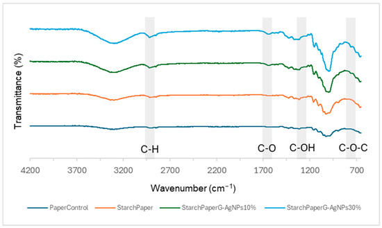 Starch-modified samples evidenced the OH, C-H, C-O-C, and C-O functional groups, respectively. Furthermore, the characteristic C-O-C ring vibration in starch leads to an absorbance peak at around 700–900 cm−1 not detected in the paper control sample (Figure 5). The C-O bending associated with the OH group causes an absorbance peak at around 1648 cm−1.