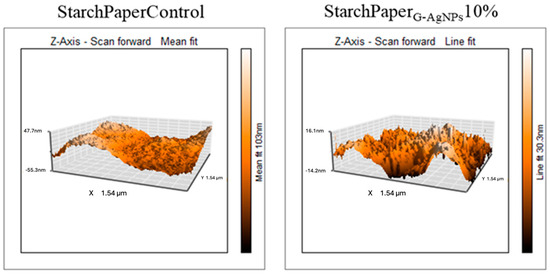 The roughness of coated papers has been measured by means of AFM analysis. The presence of AgNPs did not affect the roughness of starch-coated materials with an average value of 80.2 ± 12.2 nm for StarchPaperG-AgNPs10%, and 77.9 ± 8.6 nm for control with starch (Figure 6). Starch mainly contributes to the material roughness, while the AgNPs, due to the comparable size of the roughness, did not contribute to a statistically increased value. However, AFM allowed the detection of G-AgNPs on the paper surface not detected in the control (Figure 6). The revealed diameter of detected AgNPs was 45.2 ± 6.2 nm. The higher diameter detected by AFM compared to SEM images can be due to the G-AgNPs interacting with starch, which can act as a further stabilising agent of the AgNPs, resulting in a larger size.