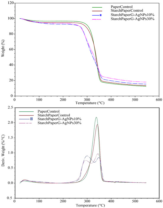 TGA thermograms of starch paper nanocomposites coated with different concentrations of G-AgNPs.