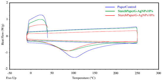 The melting temperature of the starch paper nanocomposites was determined from the DSC heating thermograms, which are shown in Figure 8 and Table 5. The results of DSC thermograms did not indicate the glass transition temperature (Tg) for the bionanocomposite films.