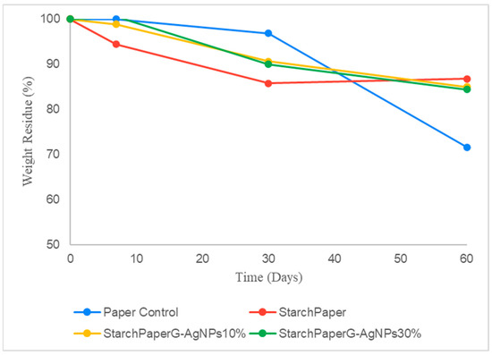 The results of soil bio-disintegration weight loss and pictures are reported in Table 7. The results obtained of the starch paper materials weight losses during the degradation period show that more than 15% of the paper was degraded after 7 days, regardless of the G-AgNP concentrations. From the visual images of the papers, the degradation and disintegration process of the papers started after 7 days, and after 30 days they lost their initial visual integrity and were pulverized and impossible to weigh (Table 7). This result confirmed that the presence of starch, as well as G-AgNPs even at highest concentrations, did not affect the bio-disintegration process in soil of the coated materials.