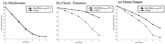 Weight loss is a parameter used for measuring the rate of food spoilage [56]. In an open system, the degradation of food is influenced not only by internal chemical processes, but also by interactions with the external environment. Barrier permeability of food packaging materials plays a crucial role in regulating the exchange of gases, particularly oxygen and water vapour, between the food product and the surrounding atmosphere [57]. When packaging materials exhibit higher permeability to water vapour, moisture from the food can readily escape into the environment. Likewise, if the packaging allows oxygen to penetrate, oxidative reactions can occur within the food matrix, leading to the breakdown of complex molecules [56]. Both of these processes contribute to the release of smaller molecules, such as amino acids, glucose, and fatty acids, into the surrounding environment, resulting in the observed weight loss of the food product. The weight loss data allow for effective safety and quality assessments of food shelf-life for a variety of storage conditions and packaging materials [52]. The results presented in Figure 10 of the most promising sample (StarchPaperG-AgNPs10%) highlight the efficacy of the developed paper-based packaging in reducing the rate of weight loss for cherry tomatoes and green grapes, commencing from day 1. A statistically significant reduction in weight was observed, amounting to 8.59% (p < 0.05) for cherry tomatoes and 6.77% (p < 0.05) for green grapes at day 6, compared to the control. Conversely, no improvement of mushroom weight loss was observed after 6 days.