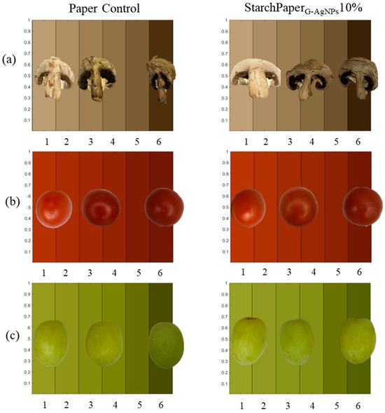 Visual comparison of colour variation from day 0 to day 6 of, (a) mushrooms, (b) cherry tomatoes, and (c) green grapes, packaged in control paper and StarchPaperG-AgNPs10%-coated paper packaging. Food pictures at days 1, 3, and 6 of trial.
