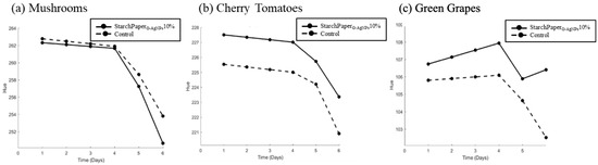 Colour hue angle of (a) mushroom, (b) cherry tomatoes, and (c) green grapes packaged in control paper and StarchPaperG-AgNPs10%-coated paper packaging from day 0 to day 6.