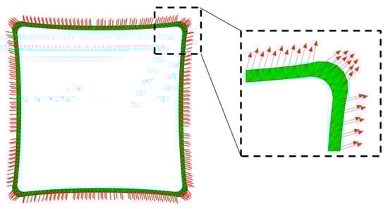 Figure 5, the direction of the strips is marked by red arrows. The direction in the corner area of the SCB after form-finding differs significantly from that in the longer arc-edge area. The direction of the strips in the corner area is approximately parallel.