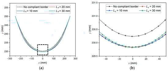 It can be observed that although the upper edges in form-finding results with different L4 misalign with each other, their central points are approximately at the same position. In contrast, the upper edge center of the membrane without SCB is 0.4 mm higher than any structure with SCB. Such a comparison shows clearly that the existence of SCB alters the membrane configuration.