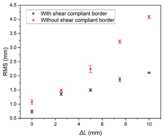 According to the fitted experimental results, for every 1 mm of displacement applied to the membrane edge, the average flatness of the specimen with SCB increases by 0.13 mm, while the average flatness of the specimen without SCB increases by 0.31 mm. This indicates that SCB reduces the rate of increase in flatness by ((0.31 − 0.13)/0.31) × 100% = 58.1%. SCB exhibits a significant inhibitory effect on the change of membrane flatness caused by shear stress, suggesting that SCB improves the stress uniformity of the membrane structure.