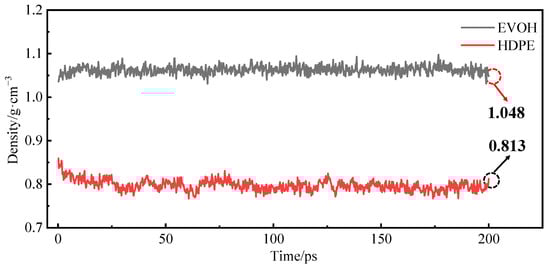During the simulation, the HDPE and EVOH models exhibit fully amorphous structures. The density variations observed throughout the relaxation process are shown in Figure 5. It can be seen that the final density of HDPE is determined to be 0.813 g/cm3, a value close to the 0.805 g/cm3 reported by Dutta [] and the 0.795 g/cm3 reported by Zheng [] in their respective simulations. In comparison to the actual density of 0.855 g/cm3 [] for HDPE in an amorphous state, the relative error is calculated to be 4.91%. Similarly, for EVOH, the observed density of 1.048 g/cm3 results in a relative error of 4.73% when compared to the true density of 1.10 g/cm3 []. Consequently, the density discrepancies for the HDPE and EVOH cell models fall below 5%, indicating the validity of the models proposed in this study.