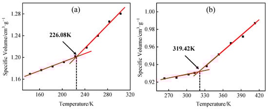 The glass transition is a commonly observed phenomenon in polymers, and the model’s accuracy can be further confirmed by the glass transition temperature. During a polymer’s glass transition, numerous physical characteristics undergo alterations, thus enabling the determination of the glass transition temperature by assessing variations in these physical attributes, such as specific volume. The HDPE and EVOH cells constructed were exposed to NVT + NPT treatment within the temperature ranges of 143–303 K and 263–413 K, respectively. The specific volume–temperature relationship was determined and is shown in Figure 6. The glass transition temperatures of HDPE and EVOH were found to be 226.08 K and 319.42 K, respectively, aligning with the experimental findings [,]. In conclusion, the model developed in this study is considered reliable.