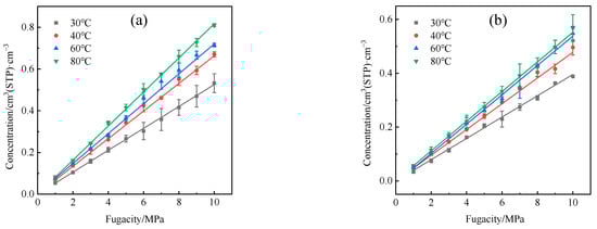 The determination of the solubility coefficient (S) of gas molecules within a polymer can be achieved through the application of the adsorption isotherm method. Under consistent temperature conditions, the adsorption isotherms are derived based on the respective solubility concentrations corresponding to various fugacities. Henry’s law is relevant to systems characterized by minimal solubility, and it can be utilized to explain the process of small gas molecules like hydrogen dissolving in polymers []. This relationship is represented by Equation (2). Notably, as the fugacity tends towards zero, the solubility coefficient can be ascertained as the limiting slope of the adsorption isotherm, as demonstrated in Equation (3):