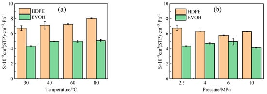 The data presented in Figure 8a illustrate that the solubility coefficient of H2 exhibited increases of 18.7% and 15.9% for HDPE and EVOH, respectively, as the temperature rose from 30 °C to 80 °C. This observed phenomenon deviates from the conventional pattern of decreasing solubility coefficients as temperatures increase. This deviation is characterized by a phenomenon known as “reverse dissolution” [,,], wherein gases with low critical temperatures, such as hydrogen, helium, nitrogen, and oxygen, exhibit increased solubility in the polymer as temperatures rise. This atypical behavior occurs because it is difficult to dissolve gases with low critical temperatures into polymers at low temperatures. However, the free volume in polymers increases with an increase in temperature, which increases the chance for gases with low critical temperatures to dissolve into polymers [].