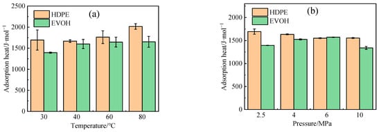 The isosteric heat of H2 adsorption in HDPE and EVOH: (a) 2.5 MPa; (b) 30 °C.