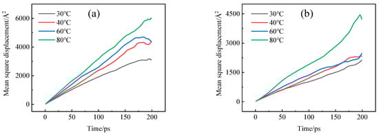 The diffusion coefficient (D) can be determined through the analysis of the mean square displacement (MSD) of molecular motion. The calculation is based on the assumption that diffusion is limited to the amorphous section of the polymer, and that this amorphous region is consistent throughout. In the context of molecular dynamics (MD) simulation, the correlation between MSD and the duration of molecular motion can be established by tracking the trajectory of the center of the penetrant molecule. Subsequently, the diffusion coefficient is computed using Einstein’s formula [], as shown in Equation (4):