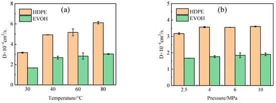 Diffusion coefficient of hydrogen in HDPE and EVOH: (a) 2.5 MPa; (b) 30 °C.