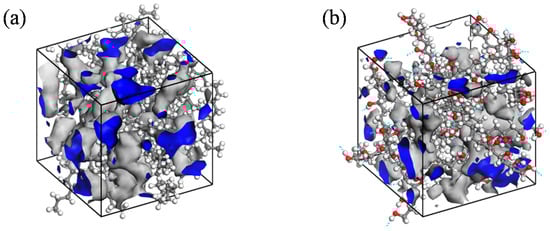 The process of gas molecule diffusion in polymers is frequently explained using the free volume theory []. This theory suggests that the polymer volume can be divided into two distinct components: the volume taken up by the polymer chain, and the interstitial space between the molecular chains, referred to as the free volume. This free volume facilitates molecular movement by allowing molecules to modify their configuration through rotational and translational movements, thus making space for their activities. A larger proportion of free volume results in an increased surface area for gas molecules to move through. The free volume of the model was quantified using the Atom Volume and Surface module, as depicted in the shaded region in Figure 12.