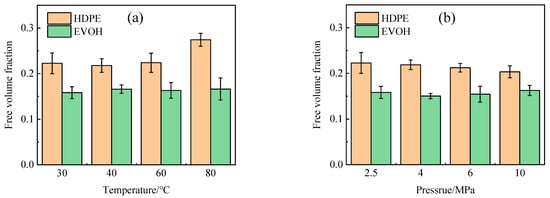 Free volume fraction of hydrogen in HDPE and EVOH: (a) 2.5 MPa; (b) 30 °C.