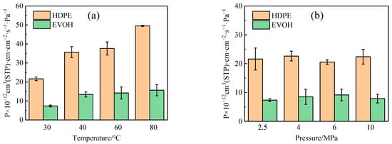 Permeability coefficient of hydrogen in HDPE and EVOH: (a) 2.5 MPa; (b) 30 °C.