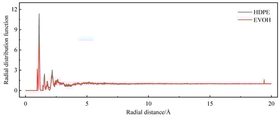 Based on the adsorption module, a density field distribution diagram and an isodensity distribution diagram of hydrogen can be derived from the cell after adsorption, as illustrated in Figure 15. The adsorption density field distribution of hydrogen indicates the concentrated distribution area of hydrogen molecules in the cell. Figure 15a,b demonstrate that the adsorption sites of hydrogen are not uniformly distributed, but rather, clustered within both cells. Nevertheless, owing to the presence of hydrogen bonds in EVOH, the adsorption of hydrogen is lower in comparison to HDPE, with the majority of hydrogen being concentrated in regions devoid of hydrogen bonds. To more clearly reflect the strength of the interaction energy between hydrogen and polymers, the radial distribution function of hydrogen in the two materials was analyzed using the Forcite module, as shown in Figure 16. The radial distribution function of hydrogen in both materials displays similar shape characteristics with a prominent peak value. The peak value of hydrogen in HDPE surpasses that in EVOH, indicating a more robust interaction between hydrogen and HDPE. The isodensity distributions are shown in Figure 15c,d, where regions of high energy are denoted in blue and low-energy areas in red. It can be seen that hydrogen molecules tend to cluster in low-energy regions, specifically the red sections in Figure 15c,d, aligning with the high-density hydrogen concentration area (blue section) in Figure 15a,b. In summary, the absorption of hydrogen in HDPE and EVOH predominantly occurs in low-energy regions, signifying aggregative adsorption.