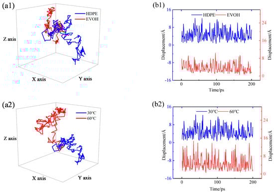 To visually observe and analyze the diffusion behavior of H2 within HDPE and EVOH, a script was utilized to extract the trajectory of H2 molecules post-simulated diffusion from the trajectory file. Subsequent processing facilitated the acquisition of the three-dimensional diffusion trajectories and displacement patterns of H2 under varying conditions, as illustrated in Figure 17. The analysis revealed that at 30 °C and 2.5 MPa, hydrogen molecules exhibit more pronounced movement within HDPE compared to EVOH, predominantly vibrating within holes with an approximate amplitude of 0.4 nm, as depicted in Figure 17(a1,b1). Notably, a few substantial transitions between holes were also observed, with amplitudes reaching around 0.8 nm, as shown in Figure 17(b1). With increasing temperature, the range of motion of hydrogen molecules expanded, progressing from around 0.4 nm at 30 °C to 0.6 nm at 60 °C. Moreover, the number of hydrogen transitions between holes increased from about 11 at 30 °C to 22 at 60 °C in HDPE, and from about 4 at 30 °C to 10 at 60 °C in EVOH (transitions exceeding 0.6 nm were considered jumps between holes), indicating a heightened diffusion capacity, as illustrated in Figure 17(a2,b2,a4,b4). Particularly noteworthy is the presence of two substantial jumps of approximately 1.6 nm at 60 °C, as depicted in Figure 17(b4). Conversely, when pressure variations were introduced while maintaining a constant temperature, minimal impact on the molecular motion of hydrogen was observed, with transition distances remaining around 0.6 nm, as shown in Figure 17(a3,b3,a5,b5), aligning with the aforementioned observations. The diffusion mechanism of gas molecules within polymers, as delineated in Figure 17, is supported by existing literature findings and conclusions. Notably, the distinction lies in the smaller diameter of hydrogen molecules, longer duration of inter-hole transitions, and stronger diffusion capability compared to methane and oxygen molecules [].