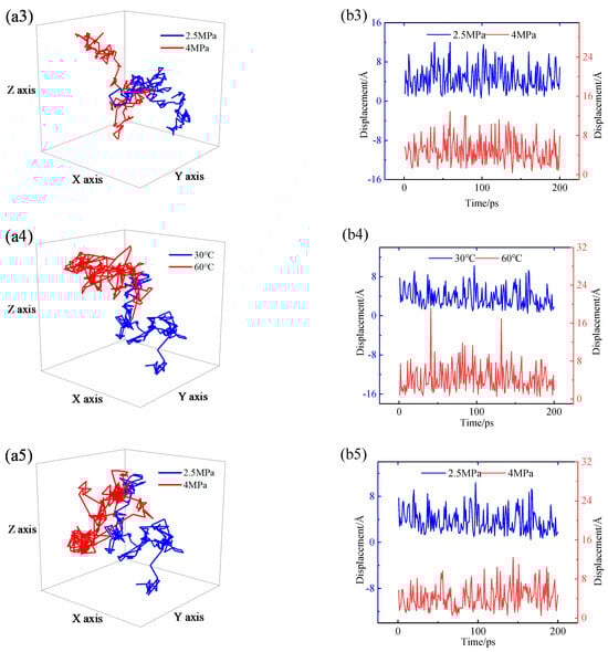 (a) Three-dimensional diffusion trajectory and (b) displacement of H2: (a1,b1) 30 °C, 2.5 MPa; (a2,b2) HDPE, 2.5 MPa; (a3,b3) HDPE, 30 °C; (a4,b4) EVOH, 2.5 MPa; (a5,b5) EVOH, 30 °C.