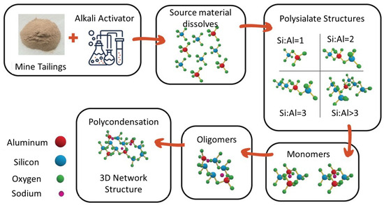 Alkali activation is a promising strategy that can utilize the aluminosilicates in the mine tailings to produce a beneficial construction material instead of the tailings just acting as a filler [7,8,9]. The alkali activator is a strongly alkaline solution used to depolymerize the aluminosilicates in the waste material, which produces silicate and aluminate monomers. These building blocks from the source material (plus any extra silica or alumina provided by the alkali activator) then interact and chemically bond to form progressively larger structures through condensation reactions that produce a bridging oxygen molecule. The 3D polymer structure develops through repeated condensation reactions, forming an amorphous aluminosilicate gel. The alkali-activated material (AAM) is then consolidated and cured, often at a slightly elevated temperature (30–80 °C) to accelerate the reaction [10,11]. This dissolution–condensation–curing process is shown in Figure 1.