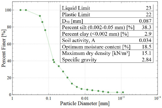 Gold mine tailings were obtained from an artisanal mine near Vitor in the Arequipa region of Peru, which contains about 1.3 million cubic meters of mine tailings deposited in a geomembrane-lined pond. This specific mine is an artisanal site which had no long-term plan for tailings storage or monitoring, so this research was intended to create value-added products using the tailings as the source material. The mine tailings were dried and homogenized prior to their use. Physical characterization tests included: (a) Harvard miniature compaction testing to determine the optimum moisture content and maximum dry density according to US Bureau of Reclamation standard GR-84-14 [23]; (b) sieve analysis and hydrometer testing to determine the particle size distribution according to ASTM C136 and D7928, respectively [24,25]; and (c) Atterberg testing to find the liquid limit, plastic limit, and plasticity index according to ASTM D4318 with hand-rolling and multi-point interpolation [26]. The purpose of plasticity testing was to characterize the clay fraction of the tailings, which affects the swelling behavior of the produced bricks. Based on the results of these tests, the tailings would be classified as AASHTO group A-4 or USCS group SM (silty sand). Figure 2 shows the particle size distribution of the mine tailings along with the results of other physical testing.