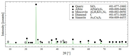 Mineralogical composition was determined through X-ray diffraction (XRD). By matching the peak position to the PDF 4+ database from the International Centre for Diffraction Data, the phase composition of the tailings could be determined. The most prevalent mineral in the specimens was quartz, with minor components of albite and muscovite. Diamond powder was used as an internal standard to calibrate the specimen displacement and correct the offset of the peak positions. A more detailed discussion of this treatment and the XRD measurement parameters is presented in Section 2.5, and the XRD pattern is shown in Figure 3.