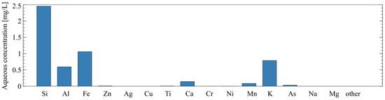 In addition to the chemical composition of the solids, the soluble fraction of the tailings was characterized using a static leaching test. Ten grams of raw tailings were added to 50 mL of 1 M sodium hydroxide and left to soak at room temperature for 24 h. The liquid was collected and filtered through a 0.45-micron filter then analyzed by ICP-AES. The chemical composition of the soluble fraction in the sodium hydroxide solution (via ICP-AES) is shown in Figure 4. This type of static leaching test has been used to evaluate the amount of reactive silica and alumina in AAM precursors in [29,30].