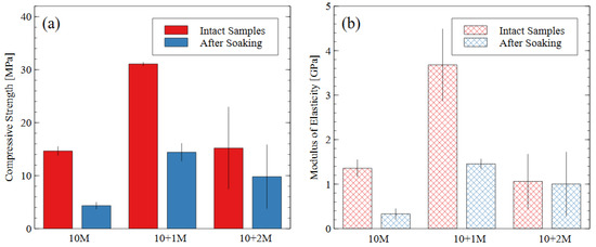 The compressive strength and modulus of elasticity of the alkali-activated mine tailings (50 mm × 50 mm × 50 mm cubes) before and after soaking in water are presented in Figure 6a and Figure 6b, respectively. When bricks were prepared from just tailings and water, the compressive strength was less than 2 MPa (not shown in Figure 6). Therefore, the 10 M NaOH activator caused the alkali activation reaction to occur and produced samples with a strength of 14.6 MPa. Thus, we can conclude that the sodium silicate improved the degree of reaction but is not the only active component of the mixture. Figure 6a shows that the water immersion test caused a strength loss of 70% in the 10 M samples, 53% in the 10 + 1 M samples, and 35% in the 10 + 2 M samples. Generally, samples with a higher compressive strength are expected to perform better during water immersion, as the hydrolytic stability depends heavily on the strength of the matrix and the products of the alkali activation reaction [42,43].