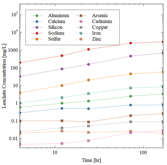 The results of ICP-AES for the 10 + 1 M specimens during the dissolution test are shown in Figure 7. The data show that the aluminosilicate gel indeed dissolved, and the damage could not be solely attributed to disintegration or swelling of the sample. The concentration of selected elements in the leachate is shown over time in Figure 7, and the general trend is the same for all the elements shown. The deleterious and hazardous elements are shown in the figure by cross markers. These specific elements of concern must be immobilized within the AAM matrix for the safe disposal of the mine tailings. The concentration of each of these elements remained below 0.1 mg/L after seven days of water immersion except for iron and arsenic (8.5 and 0.25 mg/L, respectively). The leachate concentration of chromium was below the detection limit of 0.0045 mg/L.